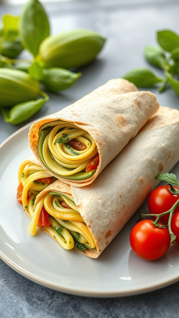 The image showcases the wrap beautifully, with the zucchini noodles peeking out, hinting at the fresh ingredients inside. Surrounding the wrap are bright cherry tomatoes and fresh basil leaves, adding to the overall appeal. This dish not only looks good but is also packed with nutrients!